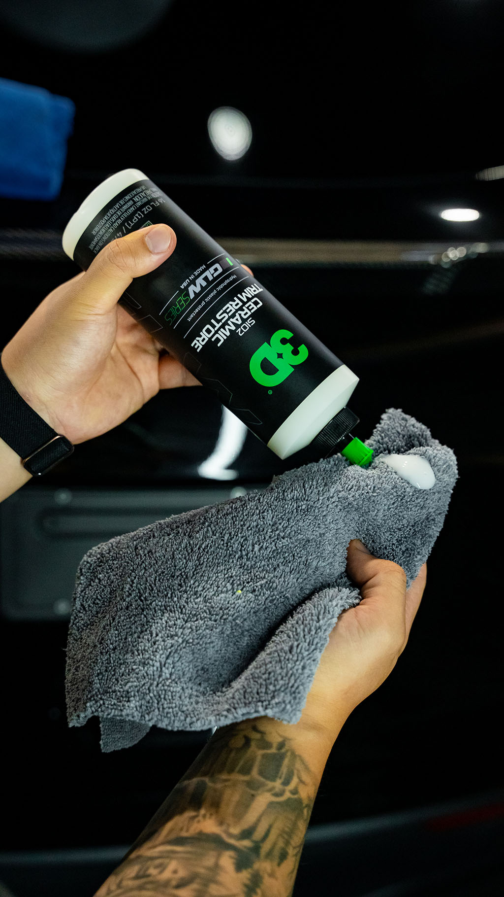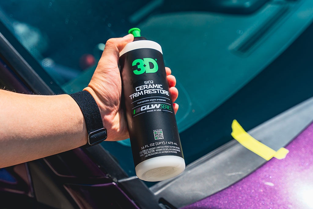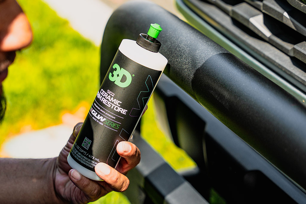 3D GLW Series SiO₂ Ceramic Trim Restore endurheimtir lit og glans á fölna plastli og veitir langvarandi keramíska vernd. SiO₂ formúlan myndar vatnsfráhrindandi og varnarlaga vernd gegn UV-geislum, oxun og veðrun. Yfirborðið fær djúpan og jafnan lit án fitukenndrar áferðar.